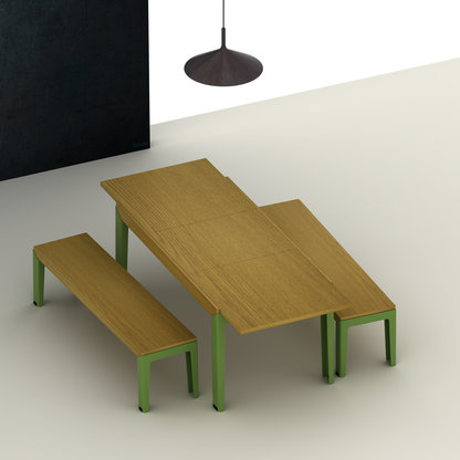Lift mechanika és tömörfa egysége Juhos Lehel lift mechanikával nagyobbítható étkezőasztalával nyert, az asztal közepén kiemelkedő plusz lapja praktikus megoldás és ötletes szerkezet egyben. A tömörfa asztallaphoz színben variálható, hajlított acéllemezből készülnek a lábak. A fém mechanikát tömörfa kávaelem rejti maga mögé, így a forma egységes és letisztult marad.