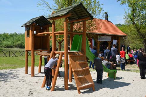 Megépült egy játszótér: természetes anyagok felhasználásával és természetbe illő kialakítással többfunkciós elemekkel a közterületi játszóterekre vonatkozó legfrissebb szabályozás szerint.