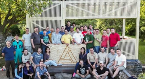 "Célunk volt, hogy a kollégáinkat megismertessük azzal a lazább, könnyedebb életstílussal, amit a Hello Wood építészei képviselnek. Erre pedig kevés jobb lehetőség van, mint egy olyan természetközeli helyen tartalmasan eltölteni két Bár péntekre virradó éjjel nagyon zuhogott az eső, ez reggelre elállt, így napsütés fogadta az építőket. A munka megkezdése előtt a Hello Wood munkatársai rövid prezentációt tartottak munkájukról, amelyet bár a legtöbb Jaf Holz-dolgozó már jól ismer az elmúlt évekből, akadtak olyanok, akik még nem találkoztak velük személyesen. Az egyeztetések után pedig hamar el is kezdődött a közös munka. Négy vegyes csapat állt össze és a szerszámok elosztása után jó hangulatban vágtak neki a pavilonhoz szükséges elemek felépítésének. Az azonban mindenkit meglepett, hogy a pavilon a vártnál hamarabb, már aznap este szerkezetileg összeállt.