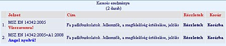 Itt azt láthatjuk, hogy a MSZ EN 14342:2005 szabványt, amely magyarra is le volt fordítva, visszavonták és a helyébe az A1 kiegészítéssel kibővített, de csak angolul rendelkezésre álló szabvány lépett 2008-ban. Ebből látható, illetve az MSZT-nél érdeklődve kiderül, hogy a CEN az A1 kiegészítéskor sajnos visszavonta az alapszabványt és a helyébe a kiegészítettett léptette. Ezért az MSZT-nek is ugyanezt kellett tennie, így a hazai forgalomban is 2008. szeptembere óta a kiegészített angol szövegű szabvány a hatályos a parketták megfelelőségének értékelése és jelölése esetén. A Részletek gombra kattintva látható, hogy 4920 Ft + áfa áron ez a szabvány meg is vehető online, vagy hagyományos úton.