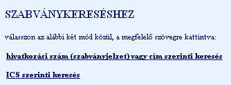 A kiindulási pont a Magyar Szabványügyi Testület honlapja, a www.mszt.hu. Itt a Szabványjegyzék menüt kell választani, majd abban a jobb oldali ingyenes termékkatalógust, itt pedig a lap alján van a szabványkeresés blokk, ahol kereshetek a szabvány száma és/vagy címe szerint, vagy ha ezt sem tudom, akkor a szakterület alapján, ez utóbbi az ICS szerinti keresés.