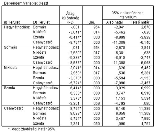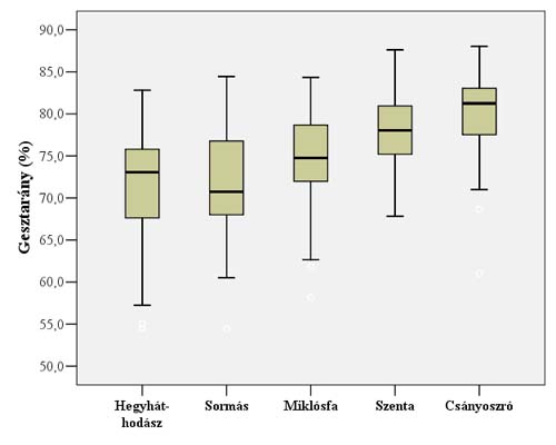 A geszt arányok eredményeit értékelve egyértelműen megállapítható, hogy bizonyos tendencia figyelhető meg a vizsgálati helyszínek szerint. Dél-keleti irányban növekedik a geszt arány (2. ábra). Az egyes helyszínek eredményeit vizsgálva jól látható a 3. ábra alapján, hogy a délebben fekvő területek adatai szorosabb tartományon belül helyezkednek el (Szenta, Csányoszró). Ugyan ez igaz az adatok 50%-os tartományára is. Mindezek arra utalnak, hogy ezek a területek megbízhatóbb eredményt produkálnak a geszt arány tekintetében. Annak megállapítására, hogy az egyes területek közötti különbségek szignifikánsak-e, azaz valódi különbséget takarnak-e, variancia analízis vizsgálatot végeztünk (ANOVA). A 2. táblázat adatai mutatják, hogy mely területek között van tényleges eltérés a geszt arányok között.