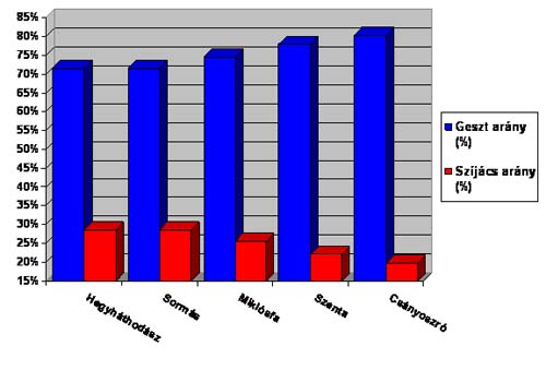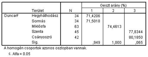 A statisztikai vizsgálat kimutatta, hogy a Hegyháthodász és Sormás területek között nincs lényeges különbség, valamint a Szenta és a Csányoszró területek között sem. Hogy mely területek adnak közel azonos (homogén) eredményt a Duncan-teszt alkalmazásával mutattuk ki (3. táblázat). A teszt alapján megállapítható, hogy három csoportra oszthatók a vizsgálati helyszínek. Első csoportba tartoznak a legkisebb geszt arányt adó területek, Hegyháthodász és Sormás. Második csoportba tartozik Miklósfa, kb. 74-75%-os értékkel, míg a Szenta és Csányoszró adta a legnagyobb értékeket (77-80%) A vizsgálati eredményekből jól látszik, hogy a három csoport kialakulásában a mikroökológiai adottságokon túl az egyes területek földrajzi elhelyezkedései is szerepet játszanak. Annak megállapítására, hogy az egyes tényezők milyen fontossági sorrendet alkotnak, további vizsgálatok, értékelések szükségesek.