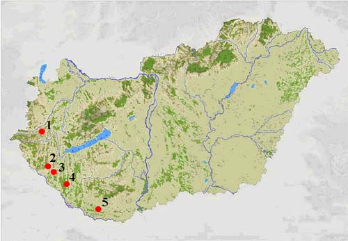 Vizsgálati módszerek A kutatás célja az volt, hogy 2006. első felében öt dunántúli helyszínen végzett erdőkitermelésből kikerülő tölgy rönkök esetében vizsgálja az egyedek bütümetszeti elemzése során feltárt fahibákat, valamint ezek, és a geszt-szíjács arány változásainak összefüggéseit az állományok életkorával, záródásával, talaj típusával, hidrológiájával, termőrétegével, és fakészlet - hozamával kapcsolatban. A helyszíneket az 1. ábrán jelzett piros pontok jelzik (1. Hegyháthodász, 2. Sormás, 3. Miklósfa, 4. Szenta, 5. Csányoszró), míg ezek földrajzi koordinátáit az 1. táblázat tartalmazza.