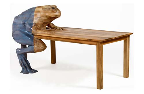 Hella Jongerius nyilvánvalóan fricskának szánta legújabb bútorát, de ezúttal kissé túllőtt a célon. A tömör diófa asztalra épp egy kövér béka tornázza fel magát, és csak reménykedhetünk benne, hogy nem fog perceken belül az asztal közepén trónolni és a tányérunkból lefetyelni, mint a Békakirály meséjének címszereplője. Csakhogy ezúttal hiába ebédelünk egy csúnya varanggyal, senki nem fog királyfivá változni. A hatalmas élőlény hátsója áttetsző kék festékbevonatot kapott, amitől kissé hűvös, nyálkás érzete lett - igaz, még így sem taszító jelenség, a gyönyörűen megmunkált diófa pont annyi nemességet kölcsönöz neki, hogy egyszer-egyszer szívesen vendégül látnánk egy királyi lakomára. Bár mindennapos asztaltársaságként nem kívánatos, halálra rémülnénk tőle, amikor éjjel kimegyünk a konyhába egy pohár vízért. Forrás: 4szobamagazin