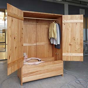Anna van der Lei tavaly diplomázott az élvonalba számító Eindhoveni Design Akadémián és úgy tippeljük, hogy sokat fogunk még hallani róla a jövőben. Ezúttal egy különös megoldással lepte meg a közönséget, ami kifigurázza azt a lecsengő trendet, amely a fürdőszobát kényszeresen a lakótérbe importálja - miközben cinkosan kacsint a holland és finn hagyományok felé. A skandináv fürdő- és szaunakultúra elképzelhetetlen a nyers fa bútorok nélkül - így van der Lei is a hagyományos alapanyagokból indult ki. A ruhásszekrénybe oltott fürdőkád nyolc éven át szárított fa lemezekből készült, amelyek ennek az eljárásnak köszönhetően nem engedik át a vizet, így nem fog elázni a nappali szőnyeg. A fürdőszekrény hordozható, így bárhol használhatjuk, csak magunkra csukjuk az ajtót, és máris békében élvezhetjük egy forró fürdő pihentető hatását.