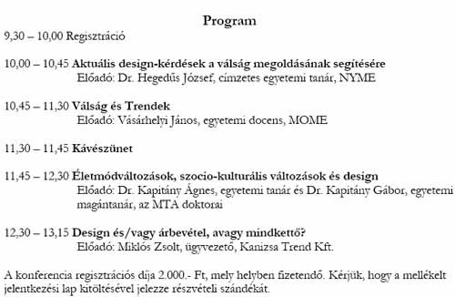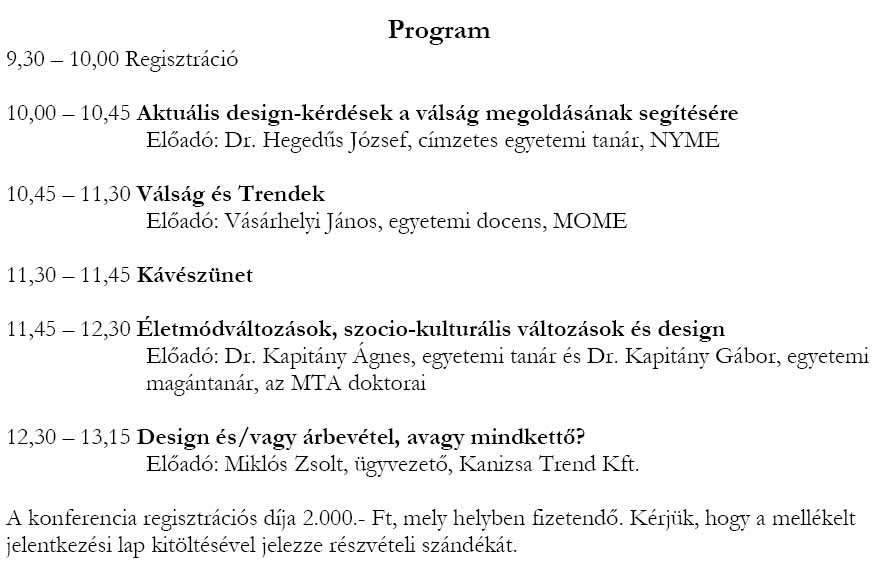 Design Konferencia, 2009. május 21. A Magyar Bútor és Faipari Szövetség a Magyar Szabadalmi Hivatallal közösen Design Konferenciát szervez, Budapesten, 2009. május 21-én.