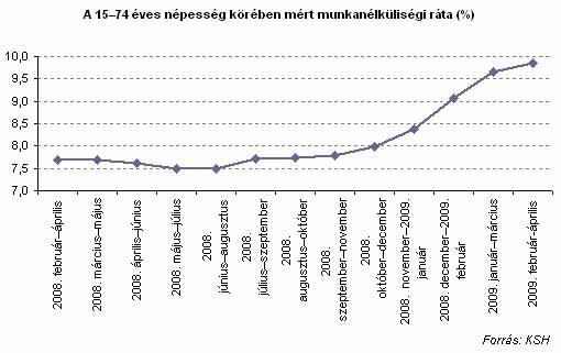A munkanélküliek 412 ezer fős létszáma az egy évvel korábbihoz képest 88 ezer fővel emelkedett. A munkanélküliségi ráta egy év alatt 2,2 százalékponttal nőtt, 9,9%-ot ért el. (Az Eurostat által publikált, a regisztrációs munkanélküliségi adatok dinamikája alapján továbbvezetett harmonizált munkanélküliségi ráta az időszak középső hónapját jelentő márciusban az EU-15-ben 8,5%, az EU-27-ben 8,3%, Magyarországon 9,2% volt.)