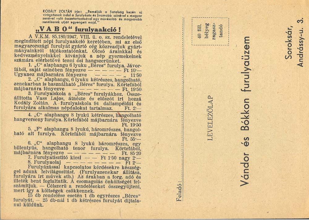 A Béres Ferenc által tervezett furulya jávorfából készült, több ezres példányszámban. Ő három évig volt rendszeres "vendége" az Andrássy utcai üzemnek. Béres János, Ferenc öccse, az első VIT-re 100 db különleges, népművészek által megfaragott furulyát vitt magával Párizsba. Az "alapfurulyát" 1 mm-rel vastagabbra hagyták az üzemben, így a faragásokat el lehetett rajta készíteni. Több híres ember is érdeklődött a furulyagyártás iránt. Muharai Elemért Béres Ferenc hozta magával. Tersánszky Józsi Jenő is sokat járt ide. Gvadányi József "billentyűs" furulyát akart gyártatni. Sok ezer furulya készült az üzemben megszűnéséig, hangszerboltoknak, iskoláknak az egész ország területén, a Magyar Kórusnak rendszeres havi kvótát szállítottak. Az üzem 1949-ben szűnt meg. Államosították, elvitték a berendezéseket, a faanyagokat. Bókkon István volt jelen az elszállításnál, mert a nagypapa - Vándor Miklós - már nem élt. A Vándor család azóta is a Szitás utca 108-ban, a Bókkon család a Láng Endre utcában lakik. Vándor Éva írása