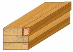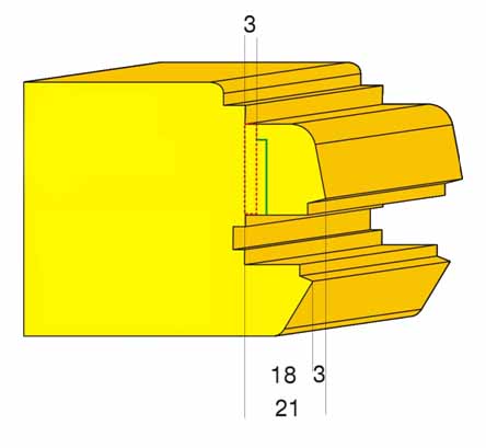 4. Az előző ábrán az is jól látható, hogy a fűrész vágásrése miatt, az üvegfalcból kivett léc esetében kb. 3 mm faanyagveszteséggel is számolni kell. 5. Az üvegfalcból kivett léc legnagyobb hátránya azonban kétségtelenül a fűrészelt felületű üvegfalcból ered. Ez nem is annyira esztétikai probléma, hisz a falc felülete takarva van, sokkal inkább szerkezeti, hiszen a fűrészeléssel elérhető - főként a fűrészlap kilengéséből fakadó - pontossági problémák, a keret összeépítése során nyitott sarokkötéseket eredményezhetnek.