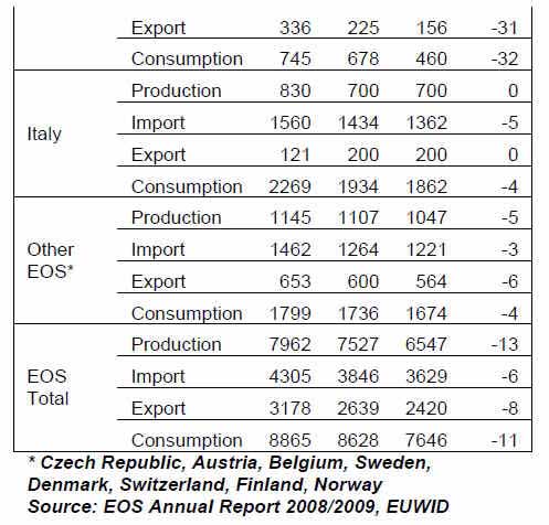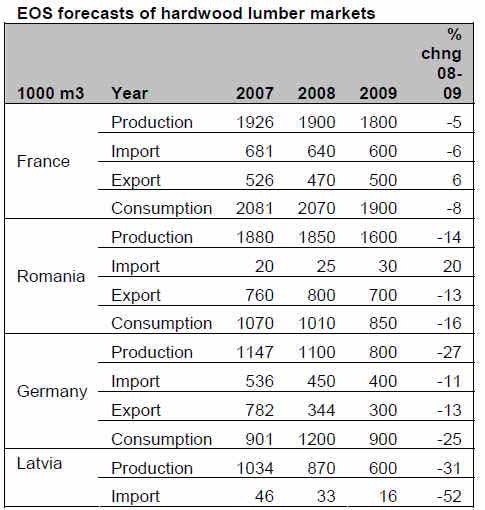 A legnagyobb termelés csökkenést tavaly Olaszország és Lettország szenvedte el. Ennek a gyenge bútoripari kereslet a legfőbb oka. 2008-ban az európai lombos-fűrészáru termelésből legnagyobb részaránnyal Franciaország (25,2%) vette ki részét, ezt szorosan követte Románia (24,6%). Emellett a lombos fűrészáru iránti igény az EOS tagszervezeteinél 2008-ban 2,7%-os csökkenést mutatott. 2009-ben, további mínusz 11% (vagyis 7,646 millió köbméternyi felhasználással számolnak) várható.