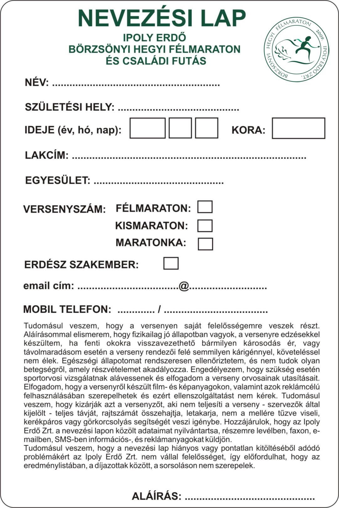 ![]() Előnevezés: A nevezési lapot teljes méretben a baloldali képre kattintva nyithatja meg. Kinyomtatva és kitöltve, a nevezési díj befizetését igazoló másolattal együtt kérjük megküldeni: az Ipoly Erdő Zrt., 2660 Balassagyarmat Bajcsy-Zs. u. 10. címre, vagy: a + 36 35 301-424 fax számra, vagy: a hegyifutas@ipolyerdo.hu e-mail címre,