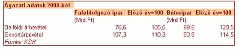 A válság nyomán a fafeldolgozó és bútoriparban 2009 első negyedévében folytatódott az előző hónapokban tapasztalt visszaesés. A KSH adatai alapján január-márciusban a fafeldolgozás 35 százalékkal, a belföldi eladás 25 százalékkal, az export pedig 34 százalékkal volt alacsonyabb, mint 2008 első három hónapjában. A termelés értéke 33,3 milliárd, a hazai