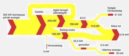 A szakmában erő-hő kapcsolatnak nevezik ezt a kiváló megoldást. Ez az áram előállítását jelenti, hozzá kapcsolva az elkerülhetetlenül megmaradó hulladékhő ésszerű felhasználását. Télen ez a hőmennyiség a legkülönbözőbb funkciójú helységek fűtésére és melegvíz előállítására használható. A fűtési szezonon kívül, ez az energia felhasználható a pellet vagy az apríték szárítására. Ezek a megoldások teszik lehetővé, hogy a maradék hő nem vész kárba. A szárítás hatására az apríték fűtőértéke jelentősen megnövekedik, ami a pellet esetében is hasznos. Természetes úton a fa max. 35% nedvességtartalomra száradhat le. Ezt még, a mérhetetlenül kis hőhulldék felhasználásával dolgozó mesterséges szárító is tovább csökkenti mintegy 10 %-ra. Egy kilogramm pellet, melynek a nedvességtartalma 10 %, 4,6 kW fűtőértékkel rendelkezik, szemben egy kilogramm 35 % nedvességtartalmú pellett alapanyaggal, melynek fűtőértéke csak 3,2 kW. Egyértelműen jelentős értéknövelő tehát a szárítás.