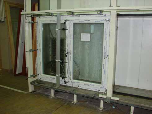 A szélállóság mérése [7] több részfeladatból áll, a vizsgálólaboratóriumban termékcsoportonként történik. Egy terméktípus adott nyitásmódú kialakításának megfelelő próbatestet kell egy mérőkamra elé felfogatni és a szabványos eljárásnak megfelelő pozitív és negatív nyomáskülönbségeknél megmérni a szerkezet behajlását, elmozdulásait. /Lásd a 2. képet./ Először a behajlás mérése történik, mely a hosszméret 150, 200 vagy 300-ad része lehet. A vizsgálat második részében fele erősségű, de váltakozó szívás és nyomás igénybevételnek van a szerkezet kitéve. A nyomás fokozatok általában 1600-2000 Pa nyomáskülönbségig regisztráltak, amely körülbelül 150-180 km/órás szélsebességnek felel meg. Végezetül a szerkezet zárási biztonságát egyszeri másfélszeres erősségű nyomásimpulzussal vizsgáljuk. /Lásd az 1. képet./ A szélterhelés hatására a szerkezet elemei, elemkapcsolatai törést, vagy rendeltetésszerű használatot akadályozó maradó alakváltozást, vagy üvegtörést nem szenvedhetnek. A mért adattal a vizsgált vagy annál kisebb felületű, azonos kialakítású szerkezet jellemezhető.