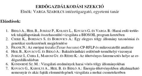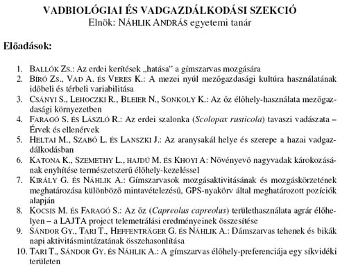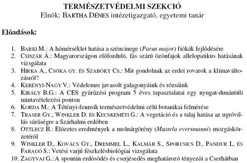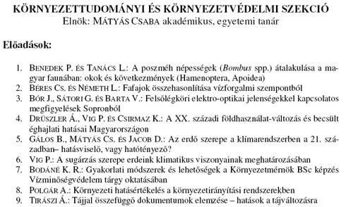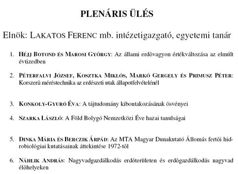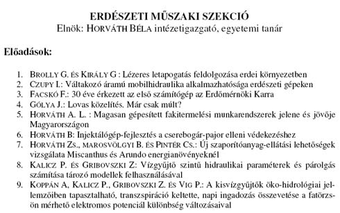 Program: 9.00 Prof.Dr. Náhlik András dékán megnyitója 9.10 - 11.30 Plenáris ülés 11.30 - 13.00 Ebédszünet 13.00 - 16.30 Szekcióülések közben 15.00 - 15.30 Szünet