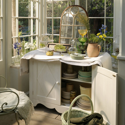 A korabeli épületeknél tiszteletben tartják és látni hagyják a fa tetőszerkezet gerendáit, a ház szinte együtt él a természettel. Bútorok tekintetében alig észrevehető a különbség a kint és bent között, ezzel is természetközeli mivoltát hangsúlyozzák. A konyhában gyakran épített konyhapult és bútor található, a fiókokat fonott kosarak helyettesítik, a tömörfa ajtót szárazvirág-koszorú díszíti. A bádogvödör, a boroshordó, a régi csatos üvegek nemcsak dekorációs elemek a térben, hanem használati tárgyként is betöltik funkciójukat a mindennapokban.