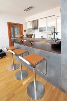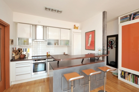 Szimbolikus térelválasztó a többfunkciós átadópult, amely - miután nincs más asztal a lakásban - egyszerre munkahely, étkező és bárpult is. Az eredeti tervekben egysoros konyha szerepelt, de a tulajdonos ragaszkodott a praktikus pult kialakításához. Ez a konyha felőli oldalon plusz tárolóhelyet jelent - a konyhabútorhoz tartozó fiókokkal rakták tele -, a szoba felé néző rész pedig a nappali stílusához igazodik, és az egyedi betonburkolatnak köszönhetően a helyiség egyik jellegzetes stíluselemévé vált. A nappali meleg színeihez igazodik a formatervezett bárszékek teveszínű bőrhuzata, és a lakás meghatározó vérnarancs árnyalata is visszatér a konyha belső részében egy témájában is jól megválasztott plakát képében.