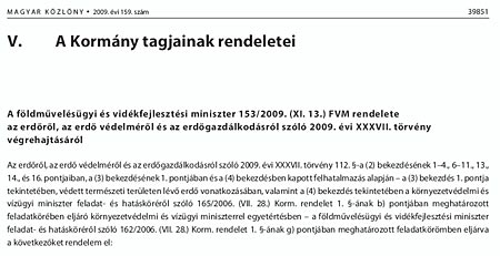 Megjelent az Erdőtörvény általános végrehajtási rendelete Megjelent "Az erdőről, az erdő védelméről és az erdőgazdálkodásról szóló 2009. évi XXXVII. törvény végrehajtásáról" szóló 153/2009. (XI. 13.) FVM rendelet a Magyar Közlöny 2009. november 13., pénteken közzétette 159. számában. A 39851. oldaltól 39885. oldalig tart = 34 oldal. Elérhető a www.magyarkozlony.hu helyen, azon belül a http://www.magyarkozlony.hu/pdf/1586 kapcsolón. Forrás: MK