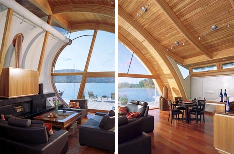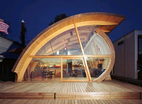 Természetes görbék - úszóház organikus fa-hullámokkal Kívül-belül, a mennyezettől a padlóig hajlított faszerkezetű úszóház egyedülálló módon formálja az alatta mozgolódó hullámokat.