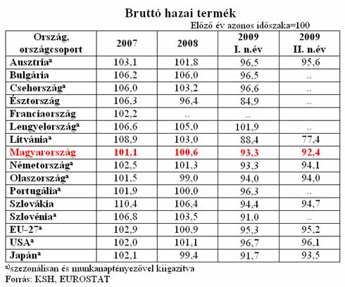 Az EU-27 gazdasági teljesítménye 2009. II. negyedévében, részben becsült adatok szerint - szezonálisan és munkanaphatással kiigazítva - 4,8%-kal visszaesett. A még nem teljes körű adatok szerint sok országban erősödött a visszaesés az első negyedévihez képest. A szezonálisan és naptári hatással kiigazított, megelőző negyedévhez viszonyított európai uniós teljesítmény már öt negyedév óta csökken, bár 2009 második negyedévében a mérséklődés üteme lényegesen kisebb volt, mint a megelőző negyedévekben. Ez év második negyedévében az USA GDP-je 3,9%-kal visszaesett az egy évvel korábbihoz képest és ez a korábbiaknál jelentősebb mértékű. A szezonálisan és munkanaphatástól megtisztított index szerint a gazdasági teljesítmény 0,3%-kal csökkent, az elmúlt egy évben a legkisebb mértékben. A teljesebb összkép érdekében bemutatom néhány számunkra meghatározó ország, illetve országcsoport főbb adatait:
