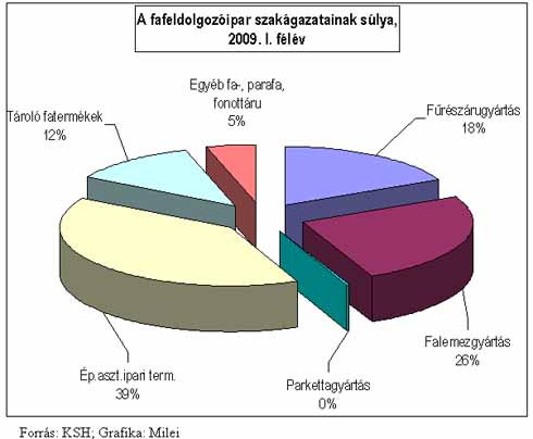 A fafeldolgozó-ipar (TEÁOR 16) 2009 I. félévi termelési értéke 77,5 Mrd Ft, belföldi árbevétele 37,8 Mrd Ft, export árbevétele 39,8 Mrd Ft volt. A feldolgozóipari termelés 24%-os csökkenése mellett az ágazat 31,6%-os visszaesést mutat. Az ez évi termeléscsökkenés az egy évvel korábbi 28,7%-os növekedés magas bázisán jött létre. A fafeldolgozó-ipar belföldi értékesítése 2009. első felében 13,3%-kal maradt el az előző évi 38,4%-os emelkedést követően. A fafeldolgozó ipar eredményei az ipari exportban sem javultak az egy évvel korábbihoz képest, mivel a 2008 I. félévi 23,3%-os bővülését követően a 2009 január-júniusi időszakban 38,7%-kal csökkent a kivitel volumene. 2009 júniusában folytatódott az előző hónapokban tapasztalt visszaesés, üteme a termelés és az export területén lassult, a hazai eladások esetében ingadozik. A termelés 2%-kal, az ipar exportja pedig 33,7%-kal volt alacsonyabb, mint 2008. júniusában. A hazai eladás ugyanakkor 29,4%-kal bővült.