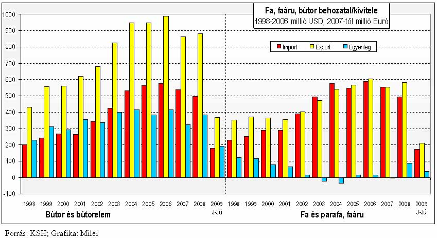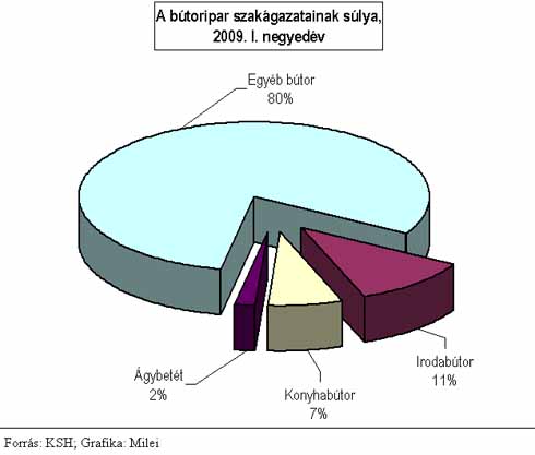 A hazai bútoripar termelése 24,8%-kal mérséklődött ez év első félévében, ezen belül az első negyedévben 28,4%, a másodikban 21,1% volt a volumencsökkenés. 2009. júniusában 21,3%-kal csökkent a szakágazat termelése az egy évvel korábbihoz képest. A belföldi értékesítés az első hat hónapban 43,9%-kal, júniusban 28,3%-kal esett vissza. Az export csökkenésének üteme jelentősen elmaradt a termelés és belföldi értékesítés csökkenési ütemétől. Az első félévben 3,1%-kal, ezen belül az I. negyedben 4,9%-kal, a másodikban 1,1%-kal mérséklődött, júniusban pedig 11,2% visszaesett a kivitel. A fa alapanyagok 2009. január-júniusi forgalma - több év után - pozitív egyenleggel zárt, mértéke meghaladja a 3 milliárd forintot. A behozatal forintban 30,8%-kal, kivitelünk pedig 14,1%-kal visszaesett. A végbement egyenlegjavulás tehát részben a csökkenő behozatalnak, részben pedig az export lassúbb ütemű visszaesésének köszönhető. A fatermékek kivitele 2009 I. félévében 26,2%-kal csökkent, míg behozatalunk 18%-kal mérséklődött. Mivel a kivitel visszaesése nagyobb mértékű volt, mint a behozatalé az egyenleg közel 7 milliárd forinttal elmaradt az egy évvel korábbitól, iránya azonban pozitív maradt. 2009 első hat hónapjában a bútor és bútorelem behozatal 21,8%-kal mérséklődött. Az árucsoport kivitele a vizsgált időszakban 10%-kal csökkent az egy évvel korábbihoz képest. Az árucsoport egyenlege 12,3 milliárd forinttal kedvezőbben alakult, mint az előző évben, tekintettel arra, hogy a kivitel visszaesése lényegesen elmaradt a behozatalétól.