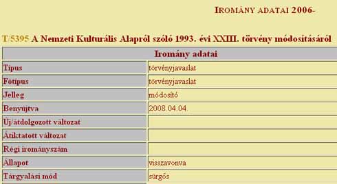 2008. évben komoly munkát jelentett az ágazat érdekképviseletei számára a T/5395 A Nemzeti Kulturális Alapról szóló 1993. évi XXIII. Törvény módosításáról szóló indítvány.