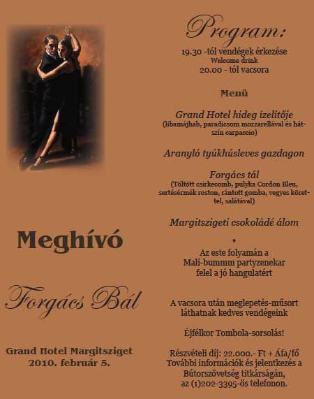 Meghívó a Forgács Bálra 2010. február 5-ére Kedves Kollégák! Ismét eltelt egy esztendő, újra bálra készülünk. 2010. február 5-én, pénteken tartjuk a hazai faiparos szakma legnagyobb fehérasztalos rendezvényét, amely a FORGÁCS BÁL,