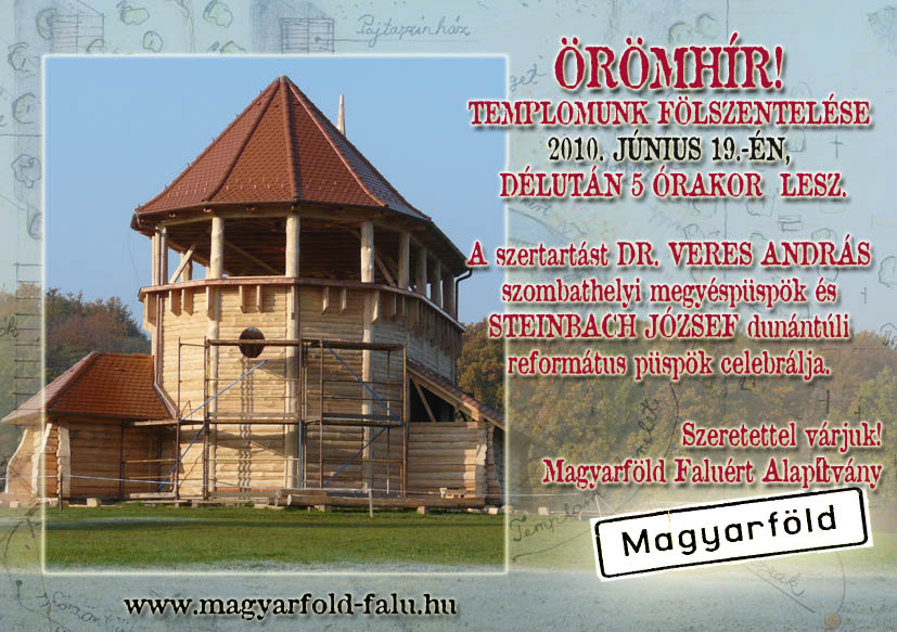 Örömhír Magyarföldön - fatemplom szentelés Magyarföld épülő fatemplomának fölszentelésére 2010. június 19-én kerül sor. A szertartást dr. Veres András megyéspüspök és Steinbach József püspök celebrálja. Korábbi írások a FATÁJ-ban: