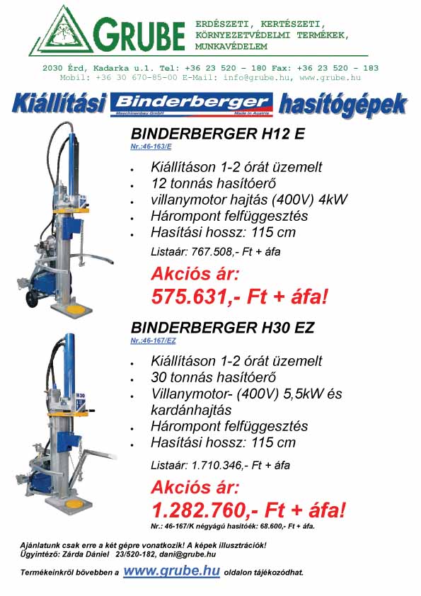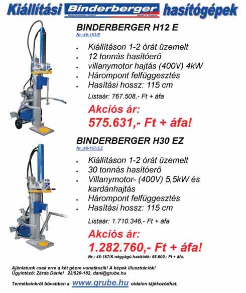 Binderberger hasítógépek - 25% kedvezménnyel BINDERBERGER H12 E, és H30 EZ típusú, kiállításon 1-2 órát már üzemelt 1-1 darab hasítógépet kínál 25% engedménnyel a Grube Kft.