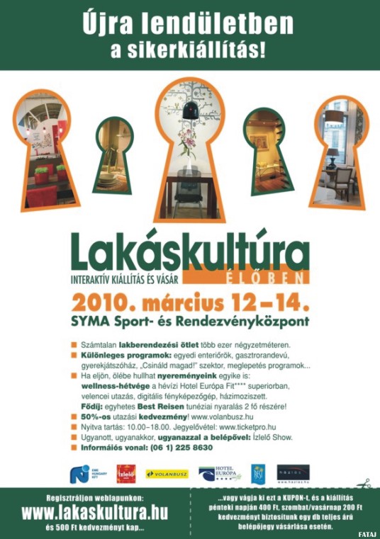 Örömmel értesítjük, hogy idén tavasszal már hetedik alkalommal kerül megrendezésre 2010. március 12-14 között, a Lakáskultúra Élőben lakberendezési kiállítás és vásár, a SYMA Sport- és Rendezvényközpontban.