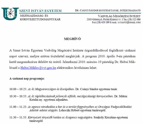 Őzgazdálkodási szakmai nap, 2010. április 9, Gödöllő A Szent István Egyetem Vadvilág Megőrzési Intézete őzgazdálkodással foglalkozó szakmai napot szervez, Gödöllőn, 2010. április 9-én. Forrás: VadászatiInformációsPortál