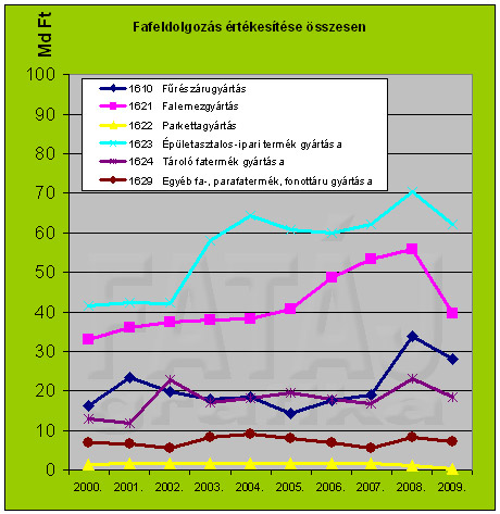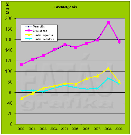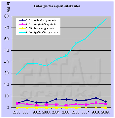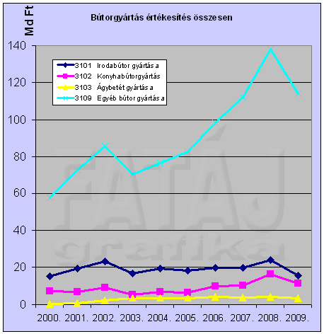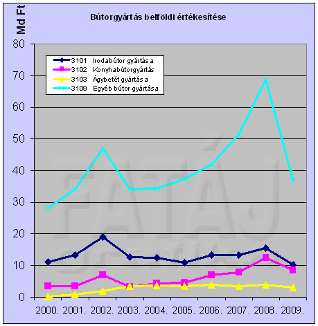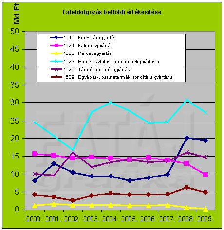 A faiparban ezen belül az export csökkenése erősebb volt, mint a belföldi értékesítésé. A legdurvább csökkenés a falemezipart érte különösen export terén, ugyanakkor belföldi eladásai enyhébben, de már 2006. óta folyamatosan hanyatlottak. Visszatekintve kicsit furcsa a fűrészipar belföldi eladásainak 2008. évi szárnyalása: a korábbi érték duplájára (10-ről 20 Md Ft-ra) ugrás, mely szintet utána 2009-ben megközelítőleg tartja e szakterület. Lehet, hogy a TEÁOR 2008-ra átállás hozhatta ezt a változást? A főtevékenységi besorolás nyilvánvaló következménye, hogy a parkettagyártás értékesítése 2000-2008. között csak 1-2 Md Ft környékén mozog, sőt 2009-re 0,4 Md Ft-ra csökken, annak ellenére, hogy a hazai összes parkettagyártás értéke 2009-ben 8 Md Ft körül lehet. Csakhogy a Bakonyerdő Parkettagyára (Zalahaláp) és az Egererdő Parkettagyára (Gyöngyös) is a cég főtevékenysége által az erdőgazdálkodásban, a Graboplast Parkettagyára (Kecskemét) pedig a műanyagfeldolgozásban jelenik meg a cég főtevékenysége miatt. Hasonlóan az erdőgazdaságok fűrészüzemeinek teljesítménye sem tükröződik az alábbi adatokban. Az épületasztalosiparban pedig a fafeldolgozásra alapított nyílászáró gyártók bizonyára megtartották ennek megfelelő főtevékenységi besorolásukat, miközben többen is hozzáláttak műanyag ablak és ajtó gyártásához. Így az épületasztalosipari adatokban bizonyára szerepel műanyagfeldolgozási teljesítmény is. A bútoriparban ugyanakkor az export - igaz nem sokat, de - még nőtt is, amivel szemben a beszakadás (részben TEÁOR átsorolás miatt) a belföldi értékesítésben jelentkezett. Az iroda, konyha és ágybetét belföldi és export eladása is visszaesett 2009-re. Sokáig zavaró tényező volt, hogy a legnagyobb tételt kitevő 3109 Egyéb bútorgyártásnak része volt a járműülés (autó, vasút, repülő) gyártása is, mely csoport egészen más, mint a hagyományos bútorgyártás. Ez más EU országok elemzőit is zavarta, ezért a járműülések gyártását átsorolták máshova, így azok teljesítménye a 2009. évi adatokban már nincs benne. [A besorolási részletek a TEÁOR-2008 2009-05-13-i változataban jól követhetőek.] Ez azt jelenti, hogy az egyéb bútor szakágazat belföldi értékesítés 2000-2008. adatsor, illetve a 2009. évi adat lényegében nem hasonlítható össze. A 2009. évi jelentős csökkenésből (-32 Md Ft-tal) nem lehet tudni, hogy mennyi volt a járműülések kategóriából kikerülésének hatása. Tartok tőle, hogy a hagyományos egyéb bútorok belföldi értékesítésében sem lehetett csekély a visszaesés. Ugyanakkor örömteli, hogy legalább az egyéb bútorok exportjában növekedés (+17 Md Ft-tal) volt 2009-re.