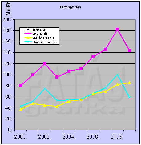 Az alábbi grafikonok a fenti szakterületek termelési, összes értékesítési és abban belföldi és export eladási értékeit mutatja milliárd forintban a 2000-2009. évekre. (A termelés és az összes értékesítés között annyira kicsi az eltérés, hogy a termelési adat szakágazati bontását feleslegesnek láttuk grafikonba feldolgozni.) Lényegében az látható, hogy az elmúlt 10 év legrosszabb éve 2009. volt. Ilyen mértékű és átfogó - gyakorlatilag minden szakágazatban megjelenő - visszaesés egyetlen más évben sem jelentkezett.