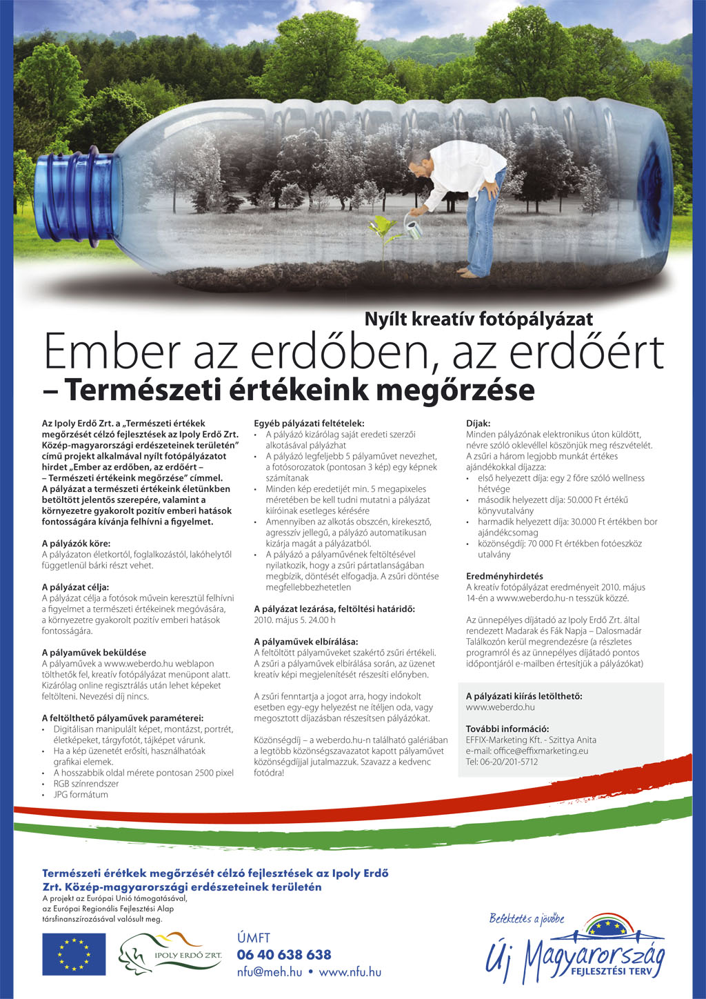Fotópályázat: Ember az erdőben, az erdőért Az Ipolyerdő Zrt. "Erdészek a természetért - Élő és élettelen természeti értékek megőrzését, rehabilitációját szolgáló beruházások" című projekt keretében márciusban Ember az erdőben, az erdőért - természeti értékeink megőrzése című fotópályázatot hirdetett meg, melynek záró időpontja: 2010. május 5. 24.00 h. A nyílt, kreatív pályázat a természeti értékeink életünkben betöltött jelentős szerepére, valamint a környezetre gyakorolt pozitív emberi hatások fontosságára kívánja felhívni a figyelmet. A pályázat részletes leírása és a pályázati feltételek, a www.weberdo.hu/fotopalyazat honlapon, valamint az alábbi plakáton találhatók. A plakátra kattintva az nagyobb méretben megnyitható. A pályázat honlapjára a hosszabbik oldalán 2500 px méretű jpg (rgb) képek tölthetők fel. A képeket szakértő zsűri bírálja el, valamint közönségszavazat is lesz. A további részleteket olvassa el a pályázat honlapján, illetve a fenti plakáton. Április 2-án már 250 feletti számú képet töltöttek fel a pályázat résztvevői.