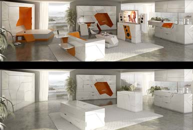 A többi bútoregység hasonlóan kifinomult és összetett rendszer: az ülőgarnitúra kanapévá és két kávézóasztallá nyitható szét, a dolgozósarok íróasztalokat, könyvespolcokat és egy széket rejt, a konyha mosogatóból, munkapultból és rengeteg tárolóhelyből épül fel, a TV-hangfal egység pedig mindent tud, ami az otthoni szórakoztatáshoz szükséges.