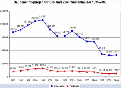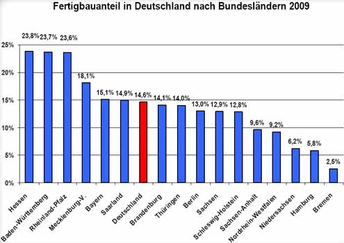 Grafikon címe: Építési engedélyek egy- és két lakásos családi házra 1995 - 2009 Előgyártott elemekből épített házak: Jönnek a hesseniek! A legtöbb engedélyt a délnyugti tartományokban adták ki 2009-ben. Míg Hessenben, Baden-Württenbergben és Rheinland-Pfalzban 23% feletti részarányt regisztráltak, addig ez az arány átlagosan csupán 14,6% az összes tartomány tekintetében. Baden-Württenbergtől 2009-ben Hessen vette át az éllovas pozíciót. A két hanzavárostól, Hamburgtól és Brémától eltekintve az utolsó hely Niedersachsené, mely tartomány mindössze 6,2%-ot tud felutatni.