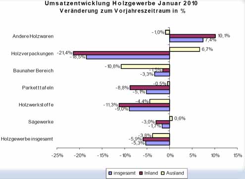 Grafikon címe: Előgyártott elemekből épített házak Németországban - tartományonként 2009-ben Faipar: nincs fordulat januárban A faipar forgalma 2010 januárjában további 5,3%-ot esett az előző év januárjához képest. A faalapú csomagolóanyag gyártás területén 18,5%-os, átlag feletti zuhanást könyvelhetünk el; pedig ugyanezen a területen a külföldi forgalom 6,7%-al emelkedett. A faipari nyersanyagok területén 9%-kal, a parketták esetében 5,3%-kal esett a forgalom, az építőipari társterület 3,3% visszaesést jelentett. Mindezekhez képest a fűrésztelepek visszaesése alacsony: csupán 1,7% forgalomcsökkenésük volt.