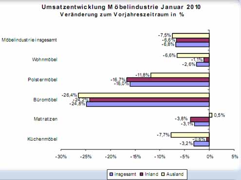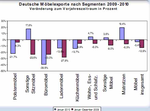 Német bútoripari gyorshírek Kárpitos- és irodabútorok gyenge startja | Konyhabútorok rontják az ágazati eredményt | Bútorgyártás tavasz nélkül | Export - irodabútorok mélyrepülésben | Erősödik a bútorimport | Export EU irányba ismét csökken Kárpitos- és irodabútor - gyenge start Végre ismét tiszta számadatok. A 2009-es statisztikai átállások és az ebből adódó, a valós piaci helyzet egyértelmű túljegyzése után, a mért állapot közelít az érzékelhető helyzethez. A január nem volt egy jó hónap, 6,8%-os mínusszal, de ha az összehasonlításhoz beszámítanánk a tavalyi év januárjának hiányzó munkanapját, akkor ez máris csak mintegy -2% - és így legalább látható lenne a nulla vonala. Ugyanakkor a kárpitos- és az irodabútorok legfrissebb adatai rosszabbak: a -16%-os és a -25%-os start nem éppen mámoros újévi kezdés.