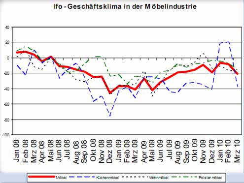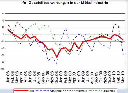 Grafikon címe: ifo - üzleti környezet a bútoriparban / piros: bútor; kék: konyhabútor; fekete: szobabútor; zöld: kárpitos bútor Bútorgyártás tavasz nélkül Az üzleti környezetben leírtak folytatódnak az előrejelzésekben is: az értéke 2010 márciusban -5-ről -16-ra süllyed. És ismét a konyhabútorok tehetők felelőssé a zuhanásért. Ez az érték a februári +21-ről kezd zuhanórepülésbe -59-ig. Ezzel "elérhetővé" vállnak a 2008-as év végi számok. Kevésbé jelentős a visszaesés a kárpitos- és szobabútorok terén: mindkettő -27 ponton áll meg.