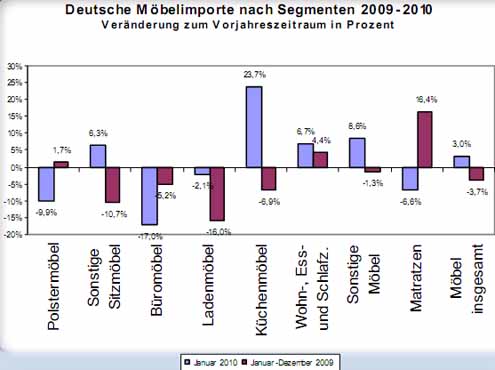 Grafikon címe: Németország bútorexportja szegmensenként 2009-2010 Erősödik az import Míg az export gyengélkedik, az import tovább erősödik. Ez 3%-os erősödést jelent a tavalyihoz képest, ami azt jelenti, hogy a kereskedelem továbbra is a külföldi termékeket részesíti előnyben. Ez főleg a konyhabútorokra igaz, ez a terület erőteljes 23,7%-os emelkedéssel hallat magáról. Kedvezően alakult a január az egyéb bútorok (+8,6%), szoba-, étkező- és hálószoba bútorok (+6,7%) valamint az egyéb ülőgarnitúrák (+6,3%) tekintetében. Romlott viszont a kárpitos- és az irodabútor területe: az import itt érezhetően visszaesett 9,9%-kal valamint 17%-kal.