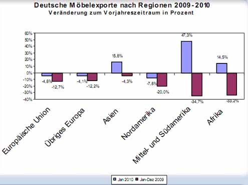 Grafikon címe: Németország bútorimportja szegmensenként 2009-2010 Export az EU-ba: ismét csökken A könnyed decemberi fellendülés után januárban ismét visszaesett az EU-n belüli export 4,8%-kal. Európa egyéb országaiba 4,1%-kal míg Észak-Amerikába 7,8%-kal csökkent a bútor kivitel. Javult a helyzet viszont Afrikában, Ázsiában valamint Közép- és Dél-Amerikában. Ezen területekre 14,5%, 15,8% illetve 47,3% volt az export növekedés januárban.
