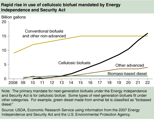 Az USA Szövetségi Mezőgazdasági Minisztériumának Gazdasági Kutatószolgálata (USDA Economic Research Service - ERS) a közelmúltban tanulmányt tett közzé az új típusú - cellulóz alapú etanol, biodízel, alga alapú - bioüzemanyagok előállításának helyzetéről és jövőbeni kilátásairól. Az USA 2007-es energiatörvénye rendkívül ambiciózus mandátumokat határozott meg a megújuló üzemanyagok, és ezen belül is az ún. fejlett bioüzemanyagok számára. Az eredeti célkitűzés szerint 2010-re 379 millió liter (100 M gallon), 2022-re pedig 60 milliárd liter (16 Md gallon) cellulóz alapú üzemanyag termelésére lenne szükség. Ehhez képest 2010. elején a Környezetvédelmi Ügynökség (Environmental Protection Agency - EPA) 24 millió literre (6,5 M gallon) csökkentette a tényleges 2010-es mandátumot, mert jelenleg nem áll rendelkezésre megfelelő üzemi kapacitás a célérték teljesítéséhez. (Folyadék esetén 1 USA gallon = 3,785 liter.) A 2007. évi Energia függetlenségi és biztonsági törvény az új típusú bioüzemanyagok felhasználást 2022-ig az alábbiak szerint tervezte. Az időszak végére a cellulóz alapú bioüzemanyag felhasználása meghaladja a hagyományos (kukorica) alapon gyártottét, e tervek szerint.