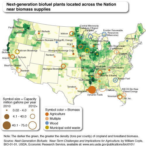 Az alábbi térkép mutatja az új generációs bioüzemanyag üzemeket (telekörrel a 2010. és körvonallal a 2012. és utána kapacitást), valamint a biomassza forrásokat. Utóbbinál minél sötétebb a zöld, annál nagyobb a gabona, illetve erdő sűrűség (tonna/megye). A kék körvonalak, illetve telekörök mutatják a fa alapú üzemeket. A fenti grafikonból és az alábbi ábrából az látható, hogy a fa alapú alkohol gyártás terén igazi áttörésre majd 2012. után lehet számítani.