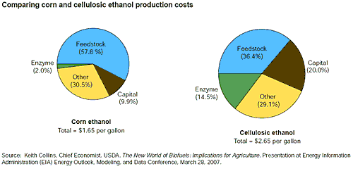 Az USDA 2007-es adatai szerint a kukorica alapú etanol előállítási költsége gallononként 1,65 $, a cellulóz alapú etanolé 2,65 $ volt. Utóbbi esetén az enzimköltség és a beruházási költség a költségek 34 %-át teszik ki (hagyományos alapú etanolnál csupán 12 %-át). A POET nevű etanolcég beszámolója szerint az egyik kísérleti üzemében 2009. novemberére 2,35 $-ra vitte le az előállítási költséget (ami még mindig messze van a versenyképességtől), míg a világ vezető enzimgyártója, a Novozymes szerint az enzimek költsége is jelentősen csökkent az utóbbi időben. Itt látható a kukorica és a cellulóz alapú etanol gyártás költség nagyságának és szerkezetének összehasonlítása. Főleg a fajlagosan magasabb enzim és a tőkeigény miatt cellulóz esetén az alapanyag költséghányada jelentősen kevesebb.