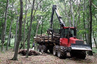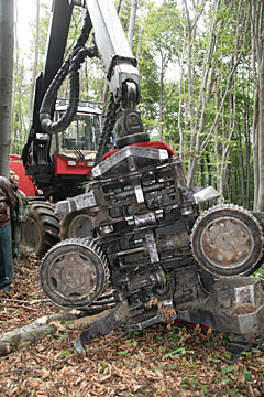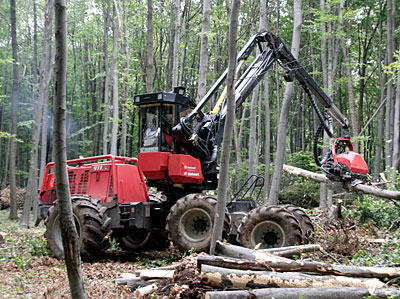 A választékcsoportokba rendezett hengeresfát Valmet 860.3-as 14 tonna raksúlyú felső-közép kategóriás forwarder szedte össze és közelítette ki a közbenső rakodóra. Ez egy speciális, hosszított rakfelületű változat, amelyik 2 x 3 m-es választék kihordására is alkalmas. Az üzemeltetők tapasztalata alapján a VALMET erőgépeket hajtó SISU Diesel motorok mind megbízhatóságukban, mind üzemanyag-fogyasztásukban egyedülállóak a piacon. A forvardert az Ihartű-2000 Erdészeti és Faipari Kft. működteti.
