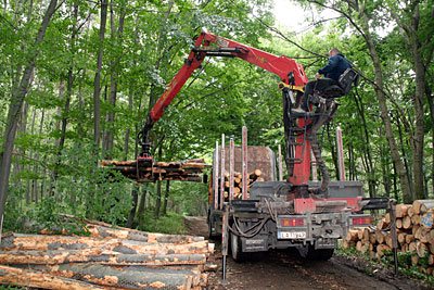 A közbenső rakodóra érkezett fát már a kamion viszi majd tovább. Itt a Bakonyi Imre EV. által működtetett szállítóeszközt láthattuk. Ez Epsilon E90Z96 daruval volt felszerelve.