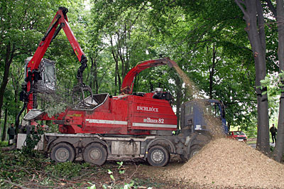 A harvester + forwarder technológia előnye, hogy az egyébként apadékként ottmaradó koronarész is teljes egészében gazdaságosan kihozható, sőt az ebből készülő apríték eladási bevétele még javítja a fakitermelési művelet pénzügyi eredményét. A Hepik Bt. (Vidos Balázs és Palásti Imre) által működtetett Eschlböck Bieber 82-es nagyteljesítményű aprítógépet láthattuk munka közben. (Ők apadék aprítással, illetve kihordás+aprítással foglalkoznak.)
