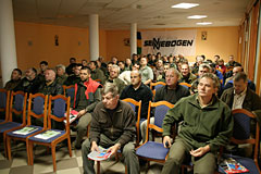 Itt a Kuhn Rakodógép Kft. vendégül látta az egybegyűlteket egyszerű, ízletes ebédre, illetve vetítéssel segített előadásban Kristofics Károly még néhány dologra felhívta a hallgatóság figyelmét. Ezek felsorolása megtalálható az itt letölthető harvester-bemutató, Stepa_Epsilon_Sennebogen-bemutató és Sennebogen-átrakó_Mitsubishi-targonca_bemutató állományokban. Érdemes ezeket áttanulmányozni. Pl. figyelemre méltó az a levezetés, melynek vége, hogy a harvester forwarder párosnak 3300 Ft/m3 a nettó működtetési önköltsége, sőt ha ebből levesszük a vágástéri apadék várható apríték árbevételét, akkor e költség még tovább csökkenthető. Nyilván ez önköltség, így a fakitermelési vállalkozói díj ennél több okból is magasabb lesz. Mindenki egyetértett azzal, hogy igen erős és hatékony szervezést kíván, hogy ilyen gépcsoportot folyamatosan elegendő munkával el lehessen látni, megfelelő legyen a kihasználtság. Ezen túl az erdőhöz, a fához, a számítástechnikához és persze a nehézgép-kezeléshez is egyszerre értő, a processzor kezelésére speciálisan kiképzett gépkezelőre van szükség. Az IHARTŰ-2000 Erdészeti és Faipari Kft., valamint a KUHN Rakodógép Kft. a képzés-továbbképzés terén is áll az érdeklődők rendelkezésére.